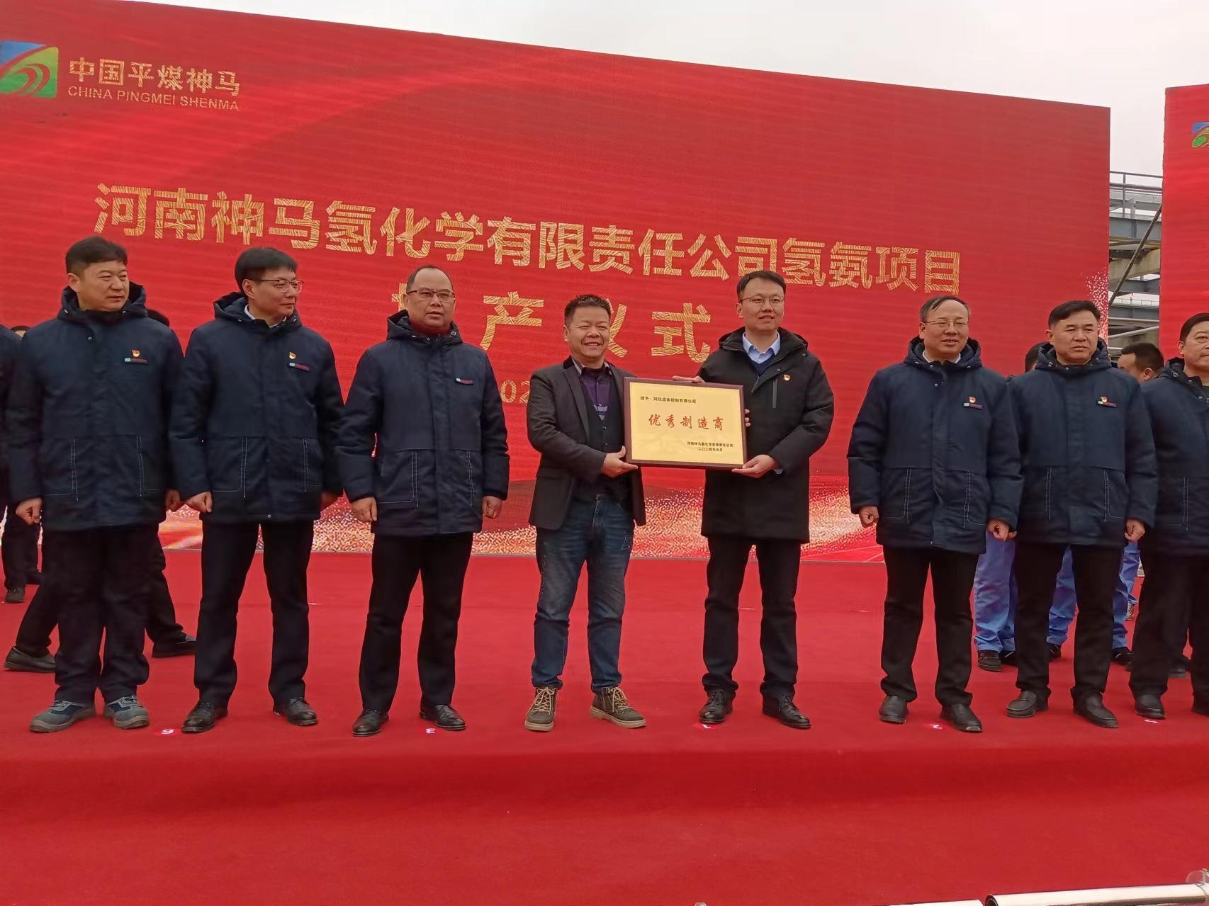 PA旗舰厅流体控制有限公司(以下简称AFA公司)董事长谢正泽先生应邀参加了投产庆典,并受到了河南神马氢化学有限责任公司党委书记执行董事王大勇等领导同志亲切会见。AFA公司被河南神马氢化学有限责任公司授予“优秀制造商”,王大勇书记亲自向AFA公司董事长谢正泽授牌。